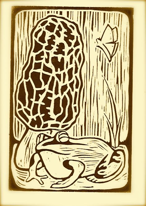 Morel and Frog is an image that doodled out of my pencil and into my sketchbook one day. I like the old Frog and Toad illustrations by Arnold Lobel. I like forest creatures. I like mushrooms and all the little bugs that crawl around in decaying wood. If this print looks childlike, well I guess that’s ok with me. Because playing in the woods, looking for frogs and mushrooms is something I havent done in a long time….since childhood. Every now and then when I’m fishing along the AuSable River I’ll stop and look at an old log or a mushroom and remember those days as a child in the woods.