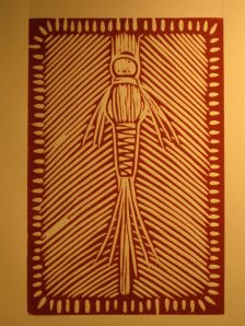 The wood was treated with Elmers Carpenter Glue (PVA) and sanded prior to cutting.  I’ve been experimenting with PVA and Shellac.  The glue method is definitely easier.  And, I think it may have worked better as far as clean up.  I’m still experiencing a lot of chipping with the Shina plywood.  Since I have very few pieces left I’m not too concerned.  I intend to buy some thicker plywood and some Cherry.  I’m really curious how the Cherry will cut.  I’ve yet to cut into solid wood.  If you asked me how I feel about this print I probably wouldnt say much.  It’s definitely a “just do it” print.  I could have spent more time working on the composition.  I could have been more careful with cutting.  But, I didn’t.  Which is why this print fits the theme perfectly.  It’s a down and dirty print.  Eleven more to go.