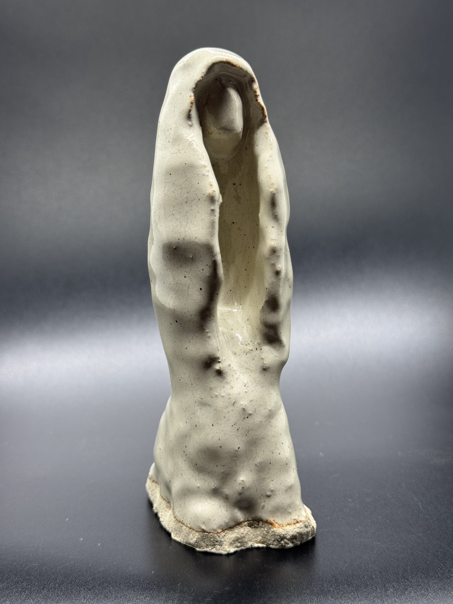 Concerning the glaze I mixed up a batch of Folk Art Guild White. I love the way it gets toasty on all the little imperfections. Yes, I said “imperfections” and I’m also a fan of Japanese aesthetic, but I’m not going to say the W word. It’s overused in my opinion. I will say what my wife and I call it when you don’t hit the mark. We call it “slobby bobby” and, I’ve made my fair share of it. This piece might even fit into the slobby bobby category. But, an artist friend once told me that it doesn’t matter how I feel about it. It only matters how you feel. As far as I’m concerned I would be fine with leaving it on a river bank and letting the next rain wash it down stream.