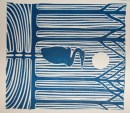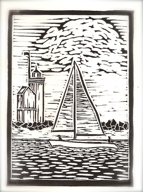 I had a piece of lino laying around so I made this quick print. I called it “Epic Journey” because my friend Joel Craig let me peruse his photos to get ideas for a sailboat print. Joel is a crew member of the sailboat “Epic” and participates in several races around the Great Lakes. The lighthouse is a rough representation of the Round Island Lighthouse near Mackinaw Island. This is hanging with the others to dry. I’ll hand paint a few of these next week.