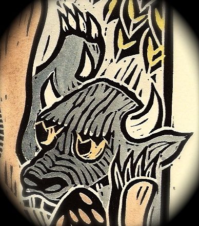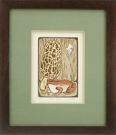 Morel and Frog, woodcut, is available at the Side Door Gallery in Dexter, MI.
