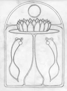 I’m still tweaking this but it’s close. I decided to go more deco than detail on this one. To get this far I used a combination of tricks. The original sketch was very loosely drawn in my sketchbook. In order to get the top radius just right I drew that with my CAD software. I also did the lily pad ellipse in CAD. Then I sketched in the flower and the base. I placed vellum over that and redrew the entire image, except I enlarged the fly and added double lines. In order to get an exact mirror image of the fly I folded over the vellum and traced the reverse image of the fly on the right. I put the circle in last and noticed it’s not symmetrical. So that’s what I’m fixing tomorrow. Then I’ll scan the image and open it with Autodesk Sketch to play with some color schemes. My goal is to complete this sketch by Friday so I can start cutting this weekend. I’ll be using carbon paper to transfer this image to my block.
