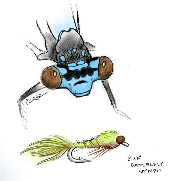 The Blue Damselfly is one of my favorite nymph patterns when fishing Devils Lake. I don’t know who invented the nymph pattern in this sketch, but it’s the one I use to take Crappies one after another in the Spring.